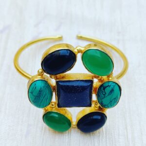 Stylish square brass cuff with green and blue oval gemstones. Perfect for boho and festive looks.