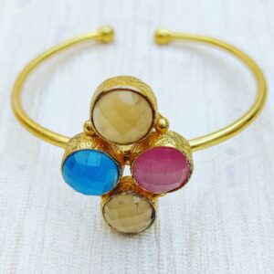 Elegant gold-plated cuff featuring four colorful semi-precious stones. A bold and artistic statement piece.