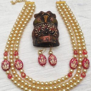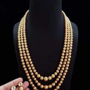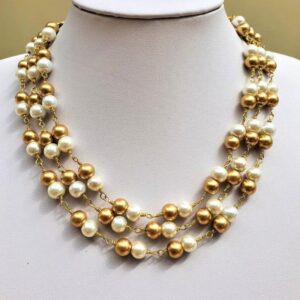 Elegant three-layer necklace with alternating gold-tone and pearl-finish beads. Ideal for weddings and festive attire.